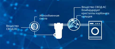 Компоненты СВОД-АС, присоединяясь к молекулам соли, меняют структуру кристаллической решетки карбоната кальция, тем самым ингибируют процесс образования накипи. Другими словами, присоединяясь к кристаллу солей жесткости, СВОД-АС прекращает его рост и предотвращает образование отложений. При этом химический состав воды практически не меняется — вода сохраняет все свои свойства и может безопасно для здоровья использоваться для бытового назначения.
