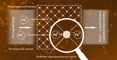 При прохождении воды через фильтр, функциональные группы захватывают и переводят железо в водонерастворимые соединения, которые механически отфильтровываются и остаются на поверхности фильтрующего элемента.