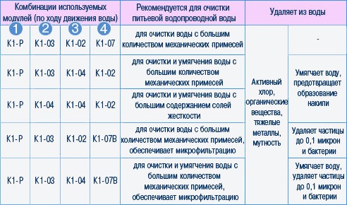 * - подразумевается бесплатная работа (услуга) по установке (подключению) указанного оборудования непосредственно в момент доставки и установки фильтра АКВАФОР Кристалл Квадро. ФИЛЬТР АКВАФОР КРИСТАЛЛ КВАДРО РАСШИРЯЕТ ВАШИ ВОЗМОЖНОСТИ ПО ОЧИСТКЕ ПИТЬЕВОЙ ВОДЫ! Водоочиститель Аквафор Кристалл Квадро - это специальное исполнение системы Аквафор Кристалл с расширенными возможностями водоочистки. Благодаря использованию четырехмодульной компоновки значительно возрастает спектр решаемых им задач. Сменные фильтрующие модули представляют единый "блок-модуль" с прочным пластиковым корпусом. При замене модулей Вам не придется отмывать фильтр АКВАФОР Кристалл Квадро изнутри от накопившейся грязи - Вы просто выбрасываете старые модули и Ваш фильтр АКВАФОР Кристалл Квадро снова готов к работе. Современный кран с керамической парой делает использование фильтра АКВАФОР Кристалл Квадро очень простым: чистая вода доступна Вам и Вашим близким без дополнительных усилий в любое время суток. Корпус АКВАФОР Кристалл Квадро продается без сменных модулей и комплектуется ими индивидуально, в зависимости от поставленной перед ним проблемой загрязнения.  Сменные фильтрующие модули для фильтра АКВАФОР Кристалл Квадро: Сменный фильтрующий модуль К1-P Удаляет механические примеси Разборный корпус модуля позволяет использовать полипропиленовые картриджи различной пористости. Сменный фильтрующий модуль К1-03 Для предварительной сорбционной очистки питьевой воды Изготовлен по технологии карбон-блок, содержит активированный уголь, ионообменное волокно Аквален и фиксированное серебро в качестве бактерицида. Снижает содержание активного хлора, тяжелых металлов и органических веществ. Эффективно фильтрует нерастворимые примеси размером до 10 микрон, в том числе Сменный фильтрующий модуль К1-02 Для сорбционной доочистки питьевой воды Изготовлен по технологии карбон-блок, содержит повышенное количество активированного угля меньшей дисперсности и волокна Аквален, а также фиксированное серебро в качестве бактерицида. Благодаря оптимальному соотношению гранулированных и волокнистых сорбентов эффективно удаляет активный хлор, ионы тяжелых металлов и органические вещества. Сменный фильтрующий модуль К1-07 Для финишной сорбционной очистки и кондиционирования питьевой воды Изготовлен по технологии карбон-блок, содержит увеличенное количество мелкодисперсного активированного угля. Содержит в качестве бактерицида фиксированное серебро. Полностью удаляет остаточные следы вредных примесей, в том числе активного хлора, тяжелых металлов и органическич веществ. Эффективно фильтрует нерастворимые примеси размером до 0,8 микрон. Сменный фильтрующий модуль К1-07В Модификация модуля К1-07 Имеет на выходе половолоконную мембрану (производство Mitsubishi, Japan), благодаря которой эффективно фильтрует микропримеси размером до 0,1 микрон и бактерии. Сменный фильтрующий модуль К1-04 Предназначен для умягчения воды Содержит ионообменную смолу. Легко регенерируется в домашних условиях. * - Подмоечный фильтр для воды Аквафор Кристалл Квадро устанавливается бесплатно сервисной службой представительства компании Аквафор по предварительной заявке. Установка фильтра Аквафор Кристалл Квадро в день доставки - платная услуга.