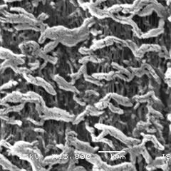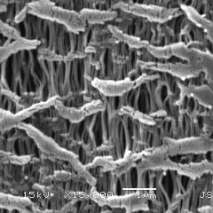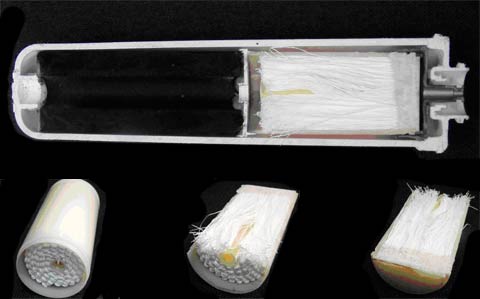 Сразу же после экструзии и полимеризации трубочки, ее подвергают строго дозированному растяжению. При этом кристаллические участки «рвутся», и в стенке образуются микроотверстия строго определенного размера. Эти отверстия в дальнейшем и отвечают за фильтрацию воды.  |  | | Структура фильтрующей поверхности полого волокна под микроскопом. Изменяя параметры экструзии и растяжения, можно получать полые волокна различного диаметра и различной пористости.  | Далее, нарезанные в размер по длине, полые волокна собирают в пучок и сгибают пополам на 180 градусов в виде «петель» таким образом, чтобы «выходы» и «входы» трубок находились с одной стороны пучка. Затем концы трубок заливают компаундом – специальным полимерным клеем. После застывания клея часть его срезают, чтобы вскрылись входы в трубки. Затем эту конструкцию помещают в корпус, направляющий поток воды, и фильтр-элемент готов! Вода поступает со стороны петель, фильтруется через стенки трубок и чистая выходит по трубкам из фильтра. |