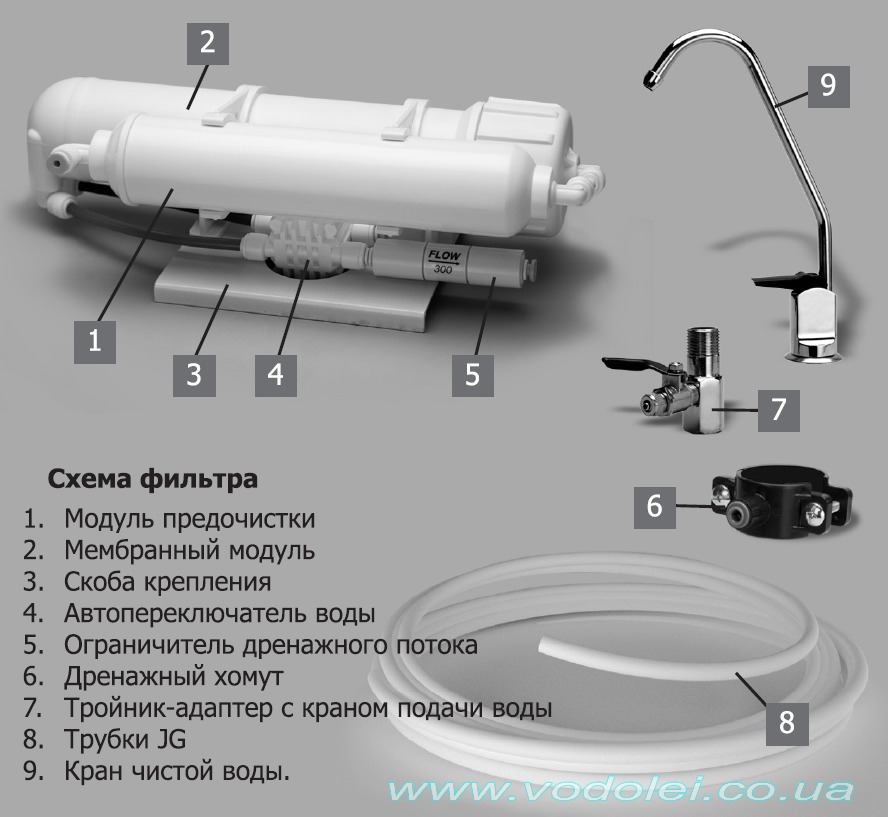 Блок предочистки и обратноосмотическая мембрана установлены в отдельных корпусах. Все модули вместе объединены в единую систему, устанавливаемую под мойкой, с выводом отдельного крана для чистой воды.