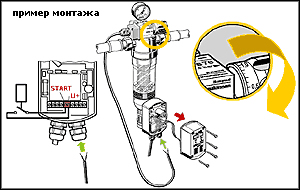 Реле перепада давления сравнивает давление в фильтре до и после сетки. Если разница давлений больше установленной, то автоматически включается привод обратной промывки.
