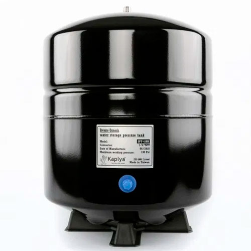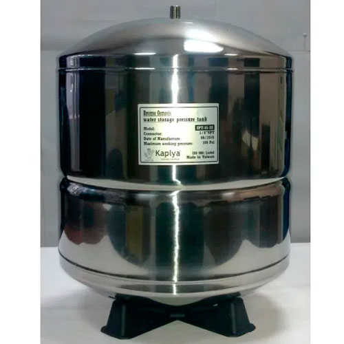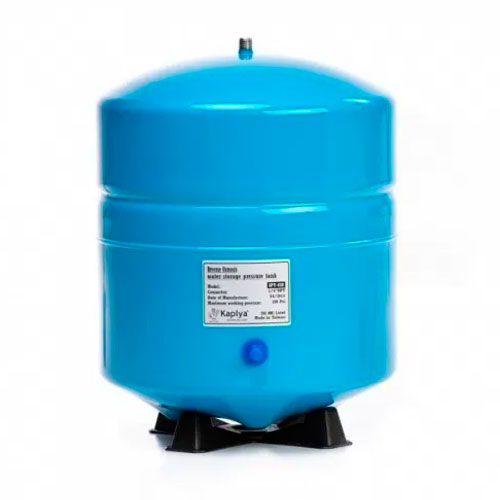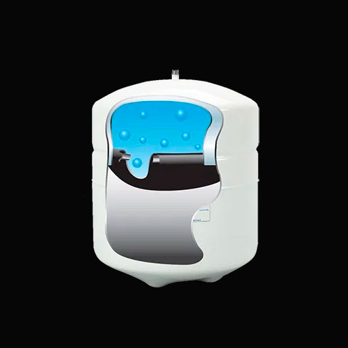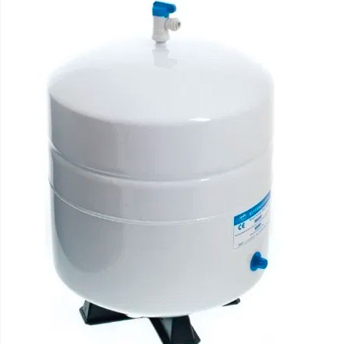 Накопительный бак для систем обратного осмоса изготовлен из высококачественной листовой стали и покрыт эмалью. Бак разделен на две камеры резиновой мембраной. В нижнюю камеру, представляющую собой некое подобие резиновой груши, закачан под давлением воздух. Благодаря давлению воздуха мембрана раздувается, и бак может полностью опорожнятся от воды. Со стороны воздушной камеры установлен ниппель, позволяющий в случае необходимости закачать либо спустить давления воздуха в накопительном баке. Сверху на баке установлена резьба, куда накручивается кран накопительного бака, для подачи и забора воды. Бак можно располагать как стоя на собственных ножках, так и лежа на специальной подставке, идущей в комплекте с баком. В базовой комплектации нет крана для накопительного бака. Данная опция при надобности приобретается отдельно.