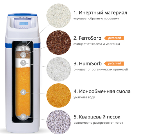 1. Инертный материал — улучшает обратную промывку. 2. Сорбент FerroSorb — уменьшает содержание железа и марганца. Механизм снижения содержания железа состоит из адсорбции (закреплении) на поверхности материала, окисления, формирования активного слоя и автокаталитического окисления. В результате уменьшается содержание всех основных форм железа: растворенного, окисленного, органического и коллоидного. Наилучшая эффективность удаления железа и марганца достигается при подаче воды из скважины непосредственно на материал Ecomix. 3. Сорбент HumiSorb — предназначен для снижения перманганатной окисляемости и цветности воды. Органические соединения удаляются по механизму электростатического гидрофобного взаимодействия. 4. Ионообменная смола (катионит) — умягчает воду. В процессе фильтрования воды через катионит происходит замена ионов жесткости Ca2+ и Mg2+ на ионы Na+. Во время регенерации ионы кальция и магния смываются в дренаж, а катионит насыщается ионами натрия из солевого раствора. 5. Кварцевый песок служит для равномерного распределения потока воды через фильтрующую загрузку во время её промывки. Регенерация фильтрующего материала Ecomix®:В процессе работы фильтрующий материал периодически регенерируется раствором соли, как и обычная ионообменная смола. - Ионы кальция и магния заменяются на ионы натрия на стадии регенерации солевым раствором.