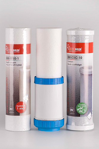 2 ступень: сорбционный (угольный) фильтр - картридж Новая вода NW-CBС-10, с брикетированным углем, который обладает большой поглощающей способностью по отношению к хлору и другим летучим органическим субстанциям, содержащимся в воде.