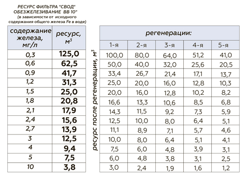 * При условии, что уровень Fe обрабатываемой воды соответствует норме 0,3 мг/л. При повышенных значениях уровня Fe ресурс определяется при помощи таблицы (дополнительное фото).