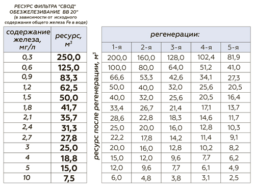 * При условии, что уровень Fe обрабатываемой воды соответствует норме 0,3 мг/л. При повышенных значениях уровня Fe ресурс определяется при помощи таблицы (дополнительное фото).