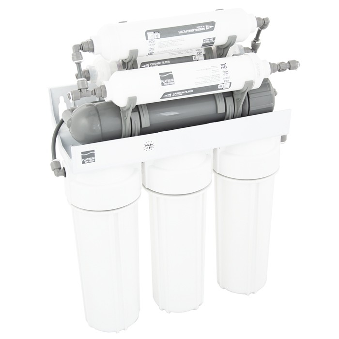 Platinum Wasser Ultra 7 - высококачественная система обратного осмоса от немецкого производителя. Система - семиступенчатая с минерализатором и биокерамическим картриджем. Фильтр устанавливается под мойкой и выводится на отдельный небольшой двойной кран для питьевой воды (очищенная и минерализированная).