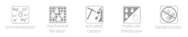 1. Механическая очистка с помощью полипропиленового картриджа на 5 мкм. Картриджем задерживается основная часть механических примесей (ржавчина, песок, осадок и т.п.) 2. Сорбционная очистка с помощью угольного прессованного картриджа. Он удаляет из воды хлор и органические примеси. 3. Механическая очистка с помощью полипропиленового картриджа на 1 мкм. Картридж доочищает воду от оставшихся механических примесей. 4. Основная очистка с помощью мембраны обратного осмоса на 75 GPD. Мембрана удаляет все загрязнения в воде, вплоть до бактерий и вирусов. Поэтому можно быть уверенным в качестве воды, которую Вы будете пить. 5. Угольный постфильтр. Доочищает воду непосредственно перед употреблением. Вода после накопительного бака проходит через угольный постфильтр, благодаря чему корректируется вкус и запах воды. 6. Минерализатор. Картридж содержит природный минерализующий доломит. Насыщает воду полезными минералами, повышает уровень pH воды, улучшает ее вкус. Мембрана на 75 GPD позволяет получать до 12 л в час чистой питьевой воды. А наличие пластикового накопительного бака на 12 л (рабочий объем 8 л) позволяет иметь постоянно чистую воду в запасе. Система укомплектована двойным питьевом краном для получения отдельно очищенной воды (для приготовления пищи), а отдельно для воды с минералами (для питья). Сроки замены картриджей в системе Platinum Wasser:Первые три картриджи предфильтрации необходимо менять в среднем 1 раз в 4-6 месяцев, угольный постфильтр - 1 раз в год, мембрану обратного осмоса - 1 раз в 2-3 года. Все сменные картриджи имеют стандартный размер и при замене можно использовать картриджи любых производителей. Нижние колбы имеют по две уплотнительные резинки и двойные ребра жесткости, что гарантирует надежность системы. Все пластиковые комплектующие являются экологически безопасными и не содержат BPA.