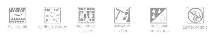 1. Механическая очистка с помощью полипропиленового картриджа на 5 мкм. Картриджем задерживается основная часть механических примесей (ржавчина, песок, осадок и т.п.) 2. Сорбционная очистка с помощью угольного прессованного картриджа. Он удаляет из воды хлор и органические примеси. 3. Механическая очистка с помощью полипропиленового картриджа на 1 мкм. Картридж доочищает воду от оставшихся механических примесей. 4. Основная очистка с помощью мембраны обратного осмоса на 75 GPD. Мембрана удаляет все загрязнения в воде, вплоть до бактерий и вирусов. Поэтому можно быть уверенным в качестве воды, которую Вы будете пить. 5. Угольный постфильтр. Доочищает воду непосредственно перед употреблением. Вода после накопительного бака проходит через угольный постфильтр, благодаря чему корректируется вкус и запах воды. 6. Минерализатор. Картридж содержит природный минерализующий доломит. Насыщает воду полезными минералами, повышает уровень pH воды, улучшает ее вкус. 7. Биокерамический картридж. Внутри находятся керамические шарики из природного минерального турмалина, который вызывает резонанс среди воды и органических молекул. FIR-лучи активируют обмен веществ, устраняют отрицательные ионы, обеспечивая естественные способности к повышению иммунитета организма. Корректируется уровень рН воды. Мембрана на 75 GPD позволяет получать до 12 л в час чистой питьевой воды. А наличие пластикового накопительного бака на 12 л (рабочий объем 8 л) позволяет иметь постоянно чистую воду в запасе. Система укомплектована двойным питьевом краном для получения отдельно очищенной воды (для приготовления пищи), а отдельно для воды с минералами (для питья). Сроки замены картриджей в системе Platinum Wasser:Первые три картриджи предфильтрации необходимо менять в среднем 1 раз в 4-6 месяцев, угольный постфильтр - 1 раз в год, мембрану обратного осмоса - 1 раз в 2-3 года. Все сменные картриджи имеют стандартный размер и при замене можно использовать картриджи любых производителей. Нижние колбы имеют по две уплотнительные резинки и двойные ребра жесткости, что гарантирует надежность системы. Все пластиковые комплектующие являются экологически безопасными и не содержат BPA.