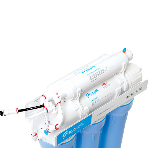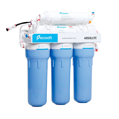 ФИЛЬТР ОБРАТНОГО ОСМОСА ECOSOFT ABSOLUTE с минерализатором Какие особенности модели? Фильтр обратного осмоса Ecosoft Absolute с минерализатором предназначен для очистки воды на молекулярном уровне и её обогащения необходимыми минералами и микроэлементами. Производительность фильтра — 8 л/час. Фильтр очищает воду от 99,8% загрязнений, включая вирусы и бактерии. Преимущества обратного осмоса Обратный осмос — наиболее совершенная технология очистки воды до безупречного качества. Это природный и экономный способ получения питьевой воды в домашних условиях. Основной элемент фильтра — мембрана, на которую подаётся вода под давлением. В результате, вода разделяется на очищенную и загрязненную, которая отводится в канализацию. Благодаря микропорам мембрана пропускает только молекулы воды и растворенный в ней кислород. После очистки вода из мембраны поступает в накопительный бак. С фильтром Ecosoft Absolute у вас всегда будет удобный источник чистой и вкусной воды. Минерализация Для восстановления минерального баланса воды в фильтре Ecosoft Absolute есть специальный картридж-минерализатор. Он представляет собой сменный элемент, заполненный гранулами минералов. В минерализатор вода подаётся из накопительного бака. Благодаря двойному крану для чистой воды, вы всегда можете выбирать, какую именно воду пить сейчас — абсолютно чистую или с минералами. Для кого подойдет лучше? Фильтр обратного осмоса Ecosoft Standard с минерализатором оптимально подходит для семей из трех человек. Производительность фильтра — 8 л/час. Вода после фильтра подходит для ежедневного питья людям любого возраста. Минерализованная вода позволяет сохранять баланс минералов и микроэлементов в вашем организме.