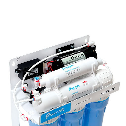 ФИЛЬТР ОБРАТНОГО ОСМОСА ECOSOFT ABSOLUTE с помпой Какие особенности модели? Фильтр обратного осмоса Ecosoft Absolute с помпой предназначен для очистки воды на молекулярном уровне в домах и квартирах со слабым напором в трубопроводе. Фильтр устойчивый благодаря металлической подставке. Производительность фильтра — 8 л/час. Для водопроводных сетей со слабым напором воды. Преимущества обратного осмаса Обратный осмос — наиболее совершенная технология очистки воды до безупречного качества. Она очищает воду от 99.8% примесей. Установка фильтра обратного осмоса — достойная альтернатива регулярной покупке бутилированной воды. Очищенная вода полностью безопасна для организма человека, так как поры мембраны надёжно удерживают бактерии и вирусы. Основной элемент фильтра — мембрана, на которую подаётся вода под давлением. В результате, вода разделяется на очищенную и загрязненную, которая отводится в канализацию. Благодаря микропорам мембрана пропускает только молекулы воды и растворенный в ней кислород. После очистки вода из мембраны поступает в накопительный бак. С фильтром Ecosoft Absolute у вас всегда будет удобный источник чистой и вкусной воды. Преимущества фильтра с помпой Поскольку мембрана имеет микропористую структуру, необходимо обеспечить определенное давление для эффективного прохождения воды через её поверхность. Если напор в трубопроводе холодной воды ниже заданного значения, то давление повышают за счет установки помпы. Кроме насоса, помпа включает в себя микроконтроллер и 2 датчика давления (на входе и выходе из мембраны). Насос вступает в работу только тогда, когда давление не соответствует нужному диапазону. Для кого подойдет лучше? Фильтр обратного осмоса Ecosoft Absolute с помпой разработан специально для квартир и домов с низким напором воды в трубопроводе. Фильтр отличается высокой производительностью (190 л/сутки). Подходит для семьи из трех человек. Очищенной воды хватит для питья, а также приготовления еды и напитков. Фильтр обратного осмоса от компании Ecosoft позволит лучше раскрыть вкус и аромат чая и кофе.