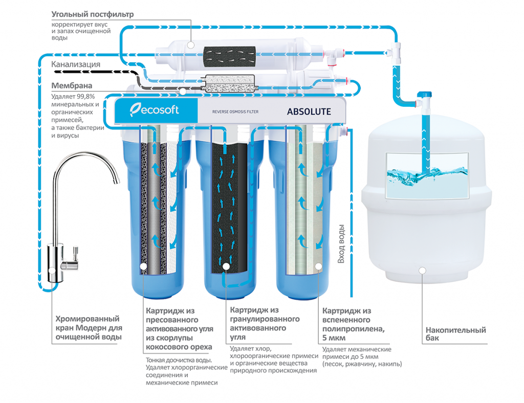 В процессе очистки вода последовательно проходит 5 этапов, для каждого из которых в фильтре предусмотрен отдельный картридж. Первая ступень Предварительная очистка воды от механических примесей. Проходя через картридж из пористого полипропиленового волокна, вода очищается от частиц ила, песка, ржавчины. Вторая ступень Очистка воды от органических и хлорорганических веществ, а также хлора. Улучшается вкус, цвет и запах воды. Внутри картриджа — активированный уголь в виде гранул. Третья ступень Очистка воды от мельчайших частиц механических примесей и остатка хлора. Картридж изготовлен из активированного угля на основе скорлупы кокосовых орехов. Четвёртая ступень Основной этап фильтрации. Вода после предварительной очистки, попадает на мембрану, которая надёжно удерживает 99,8% загрязнений. Пятая ступень Угольный постфильтр придаёт очищенной воде лёгкий, чуть сладковатый привкус.  Изменения заметите сразу!