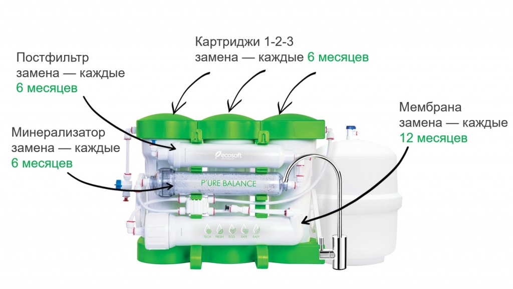 ОБСЛУЖИВАНИЕОбслуживание фильтра требует периодической замены фильтрующих элементов. Мы стремимся упростить вашу жизнь, поэтому вовремя напомним о необходимости замены картриджей. Чистая вода без лишних забот — это возможно с Ecosoft. Периодичность замены картриджей Если вы не планируете пользоваться фильтром в течение длительного времени, рекомендуется перекрыть подачу воды на него.