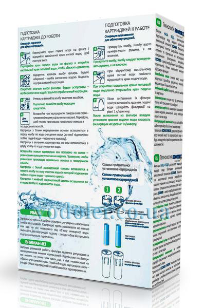 Комплект сменных картриджей Наша Вода №5 для фильтра "Родниковая Вода 2" Две ступени очистки: Первая ступень — картридж со смесью EcomixD73. Умягчает и снижает уровень минерализации воды, удаляет хлор и хлорорганические соединения. Вторая ступень — картридж со смесью EcomixD531. Удаляет железо, органические вещества; умягчает воду, корректирует вкус, цвет и запах воды. Технические характеристики сменных картриджей Наша Вода №5 для фильтра "Родниковая Вода 2": Рабочая температура воды, °С | 1–25 | Рабочее давление, атм | 2–6 | Рекомендуемая скорость фильтрации, л/мин | 1 | Ресурс одного комплекта сменных картриджей, л | 2 000 | Важно: При первом включении фильтра с новыми картриджами слейте первые 7–10 литров отфильтрованной воды в канализацию. Не следует превышать рекомендуемую скорость фильтрации воды 1 л/мин — это может ухудшить качество очистки воды. Степень очистки зависит от качества очищаемой воды и может изменяться в процессе эксплуатации. Не следует использовать сменные картриджи дольше (или для очистки большего объема воды), чем рекомендовано. В любом случае, картриджи необходимо менять не реже чем 1 раз в год. Комплект сменных картриджей предназначен для очистки только холодной водопроводной воды. Этап 5 - Пористое полипропиленовое волокно удаляет механичские примеси и задерживает частички фильтрующих материалов.